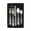 The Aladdin Antique Five-Piece Place Setting (Set of 4) features elegant pearlized handles with the strength of high-grade acrylic and 18/10 stainless steel. The handles are wrapped with intricate lattice metalwork.