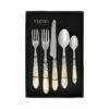 The Aladdin Antique Five-Piece Place Setting (Set of 4) features elegant pearlized handles with the strength of high-grade acrylic and 18/10 stainless steel. The handles are wrapped with intricate lattice metalwork.