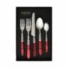 The Aladdin Antique Five-Piece Place Setting (Set of 4) features elegant pearlized handles with the strength of high-grade acrylic and 18/10 stainless steel. The handles are wrapped with intricate lattice metalwork.