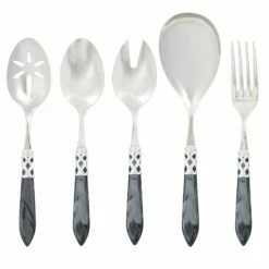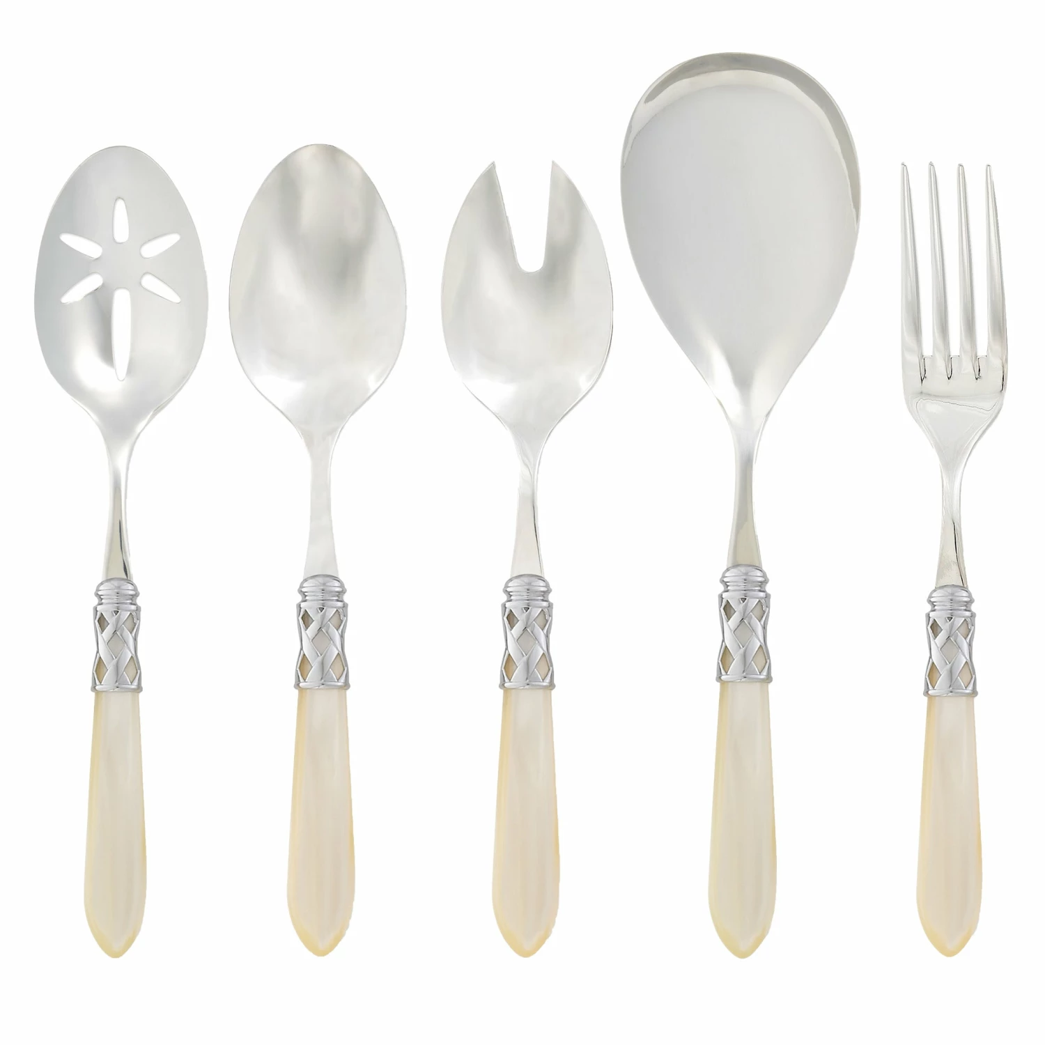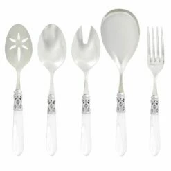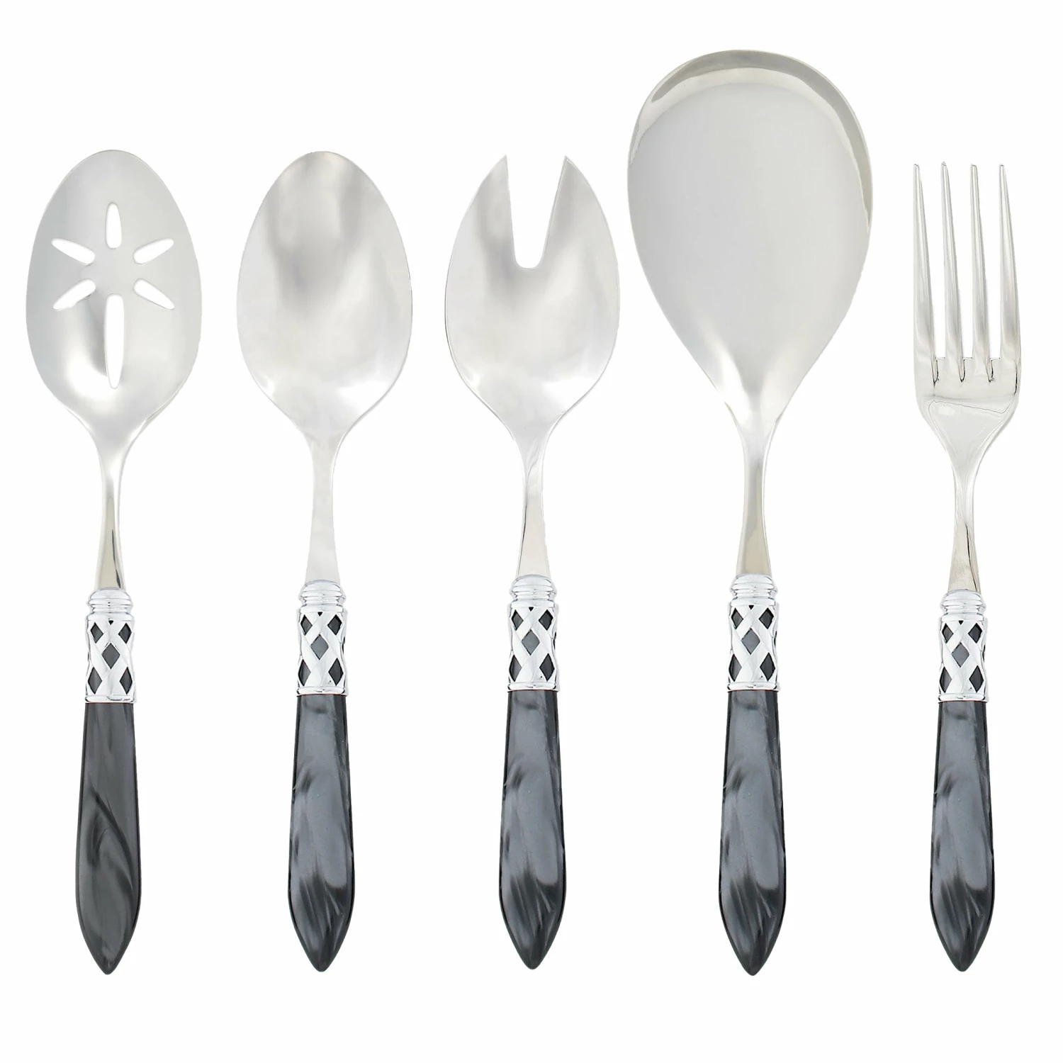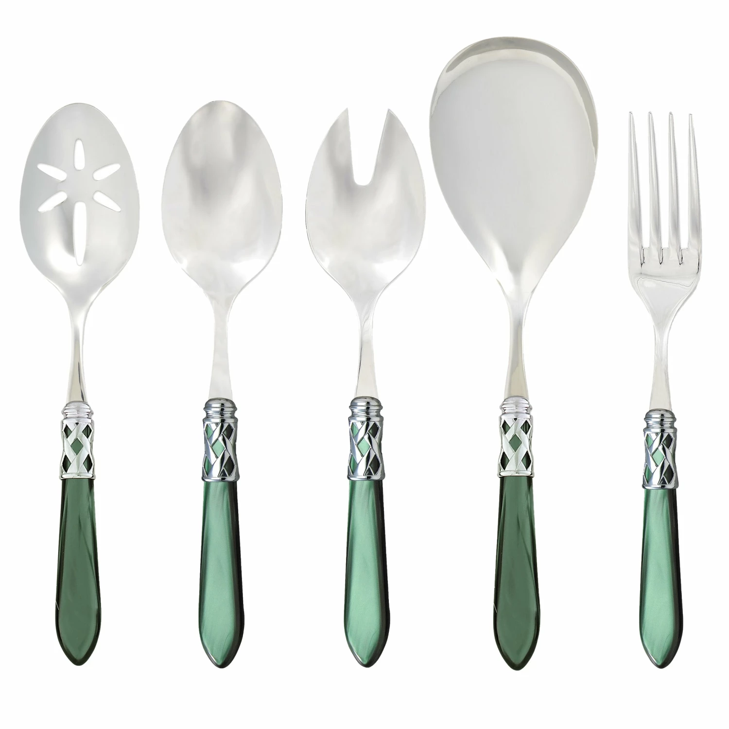 The Aladdin Brilliant Classic Serving Set is made of 18/10 stainless steel in Italy and includes the Aladdin Serving Fork, Serving Spoon, Slotted Serving Spoon, and Salad Server Set.