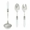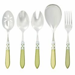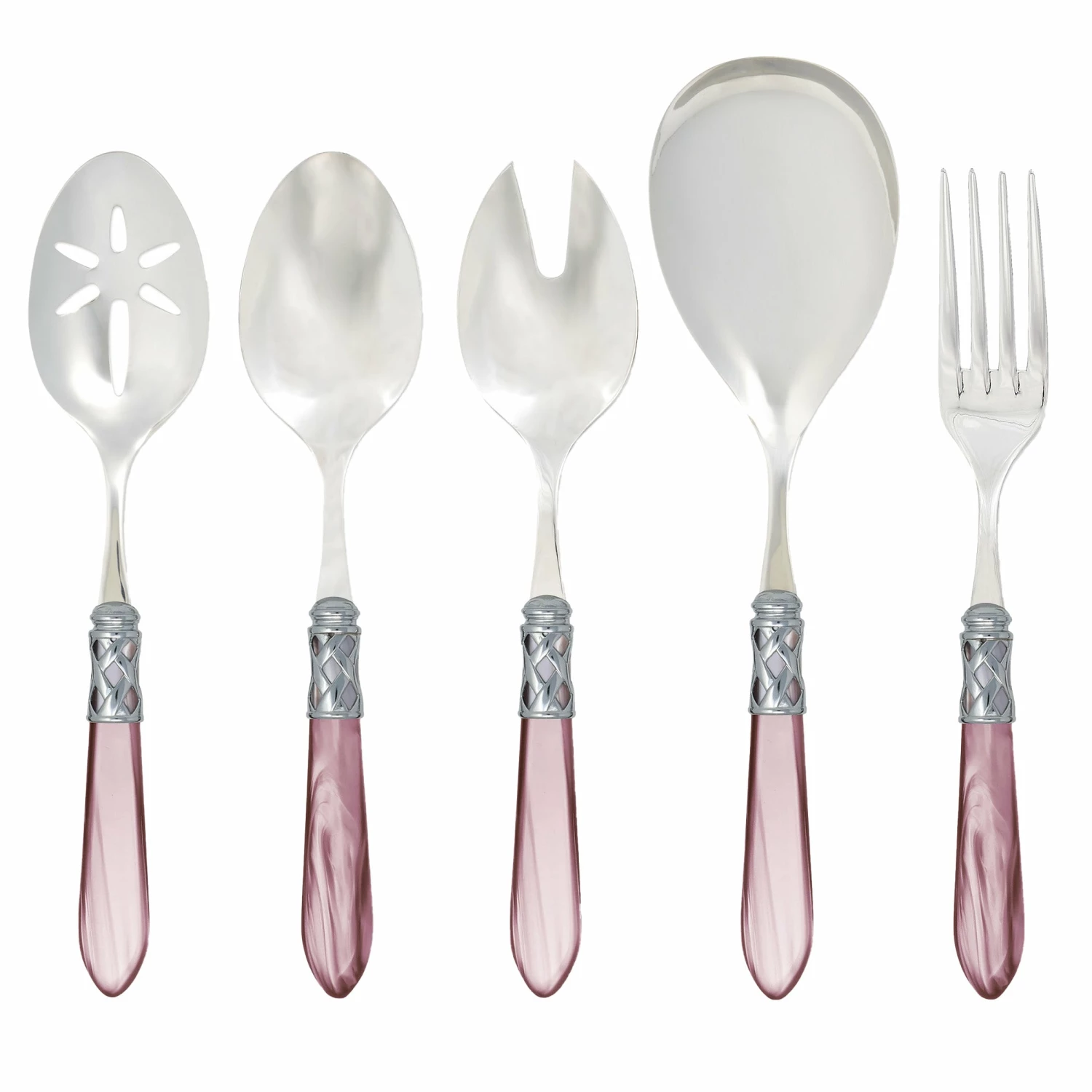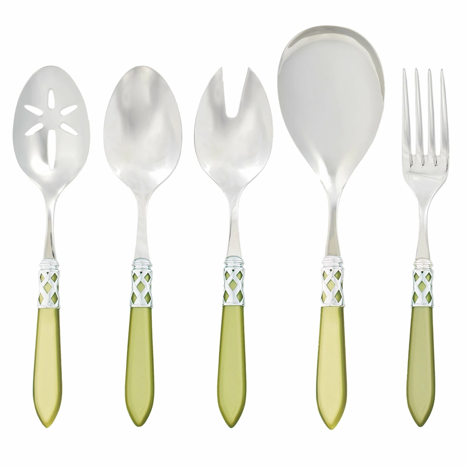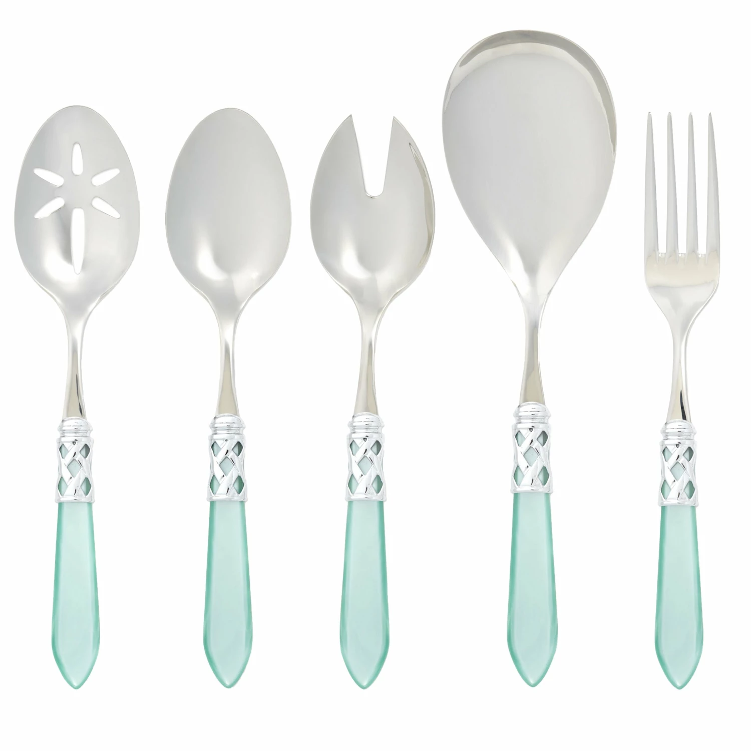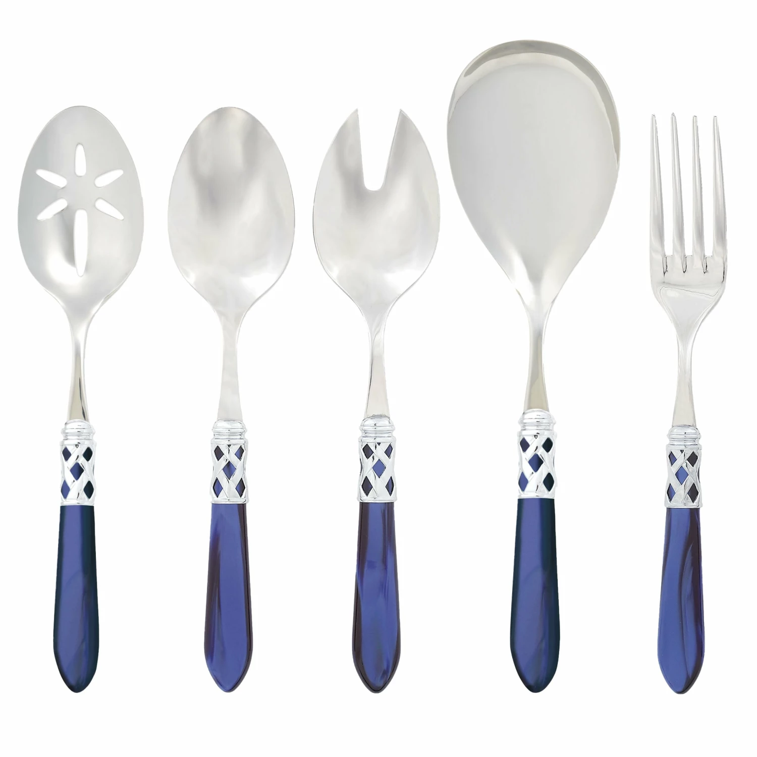 The Aladdin Brilliant Classic Serving Set is made of 18/10 stainless steel in Italy and includes the Aladdin Serving Fork, Serving Spoon, Slotted Serving Spoon, and Salad Server Set.