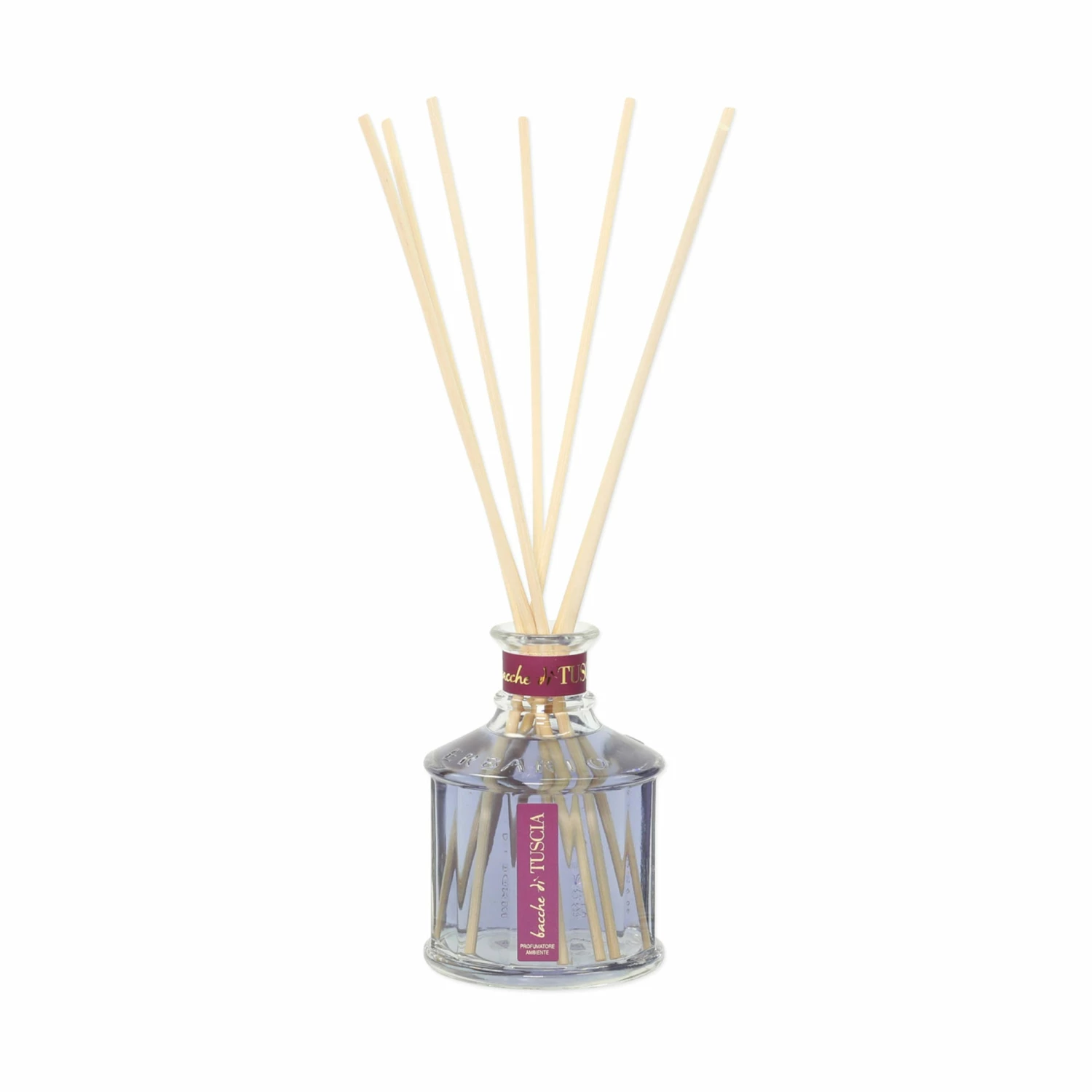 A blend of fresh fruit and warm spice, this enchanting fragrance is both lively and lush. The Bacche Di Tuscia Luxury Home Fragrance Diffuser comes in a beautiful mouthblown vessel that doubles as artwork in your home. To use, remove the stopper and dip the sticks into the fragrance. Flip the sticks upside down in order to renew the fragrance.