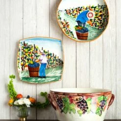 The harvesting of grapes to make wine, a long sought after tradition in Italy, is beautifully reflected in the handpainted Cantina Celebration Bucket.