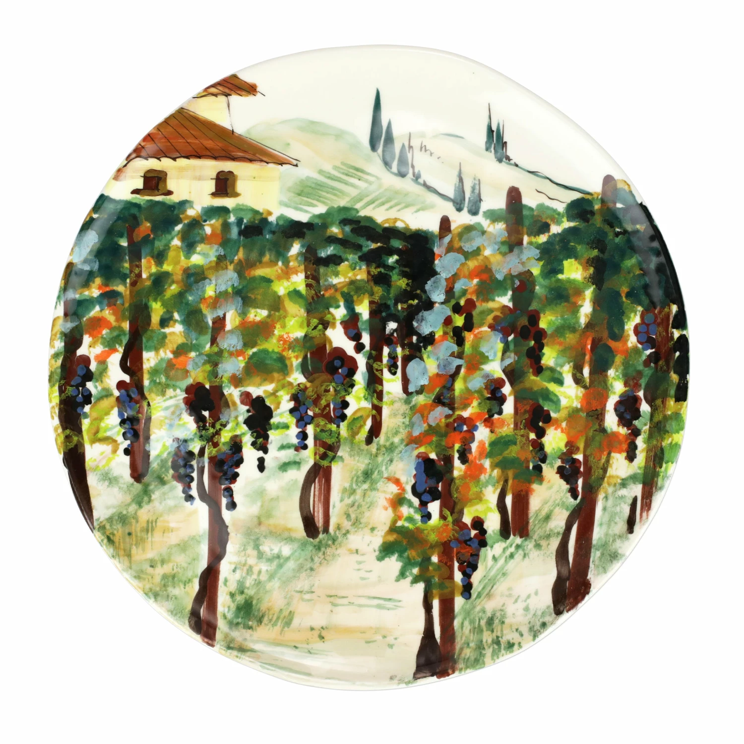 The harvesting of grapes to make wine, a long sought after tradition in Italy, is beautifully reflected in the handpainted Cantina Round Platter.