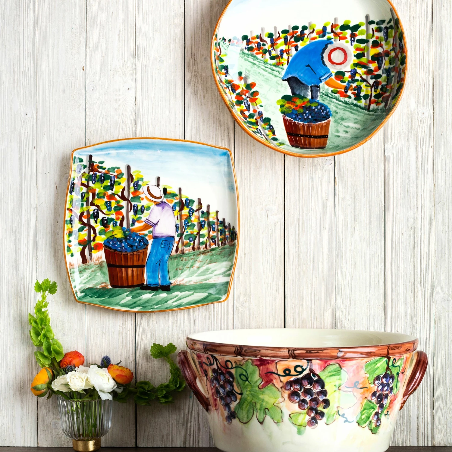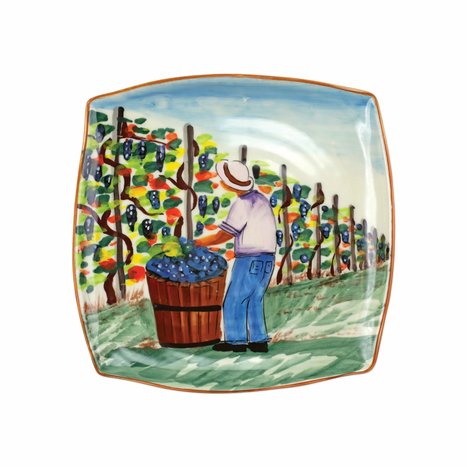 The harvesting of grapes to make wine, a long sought after tradition in Italy, is beautifully reflected in the handpainted Cantina Square Platter.