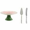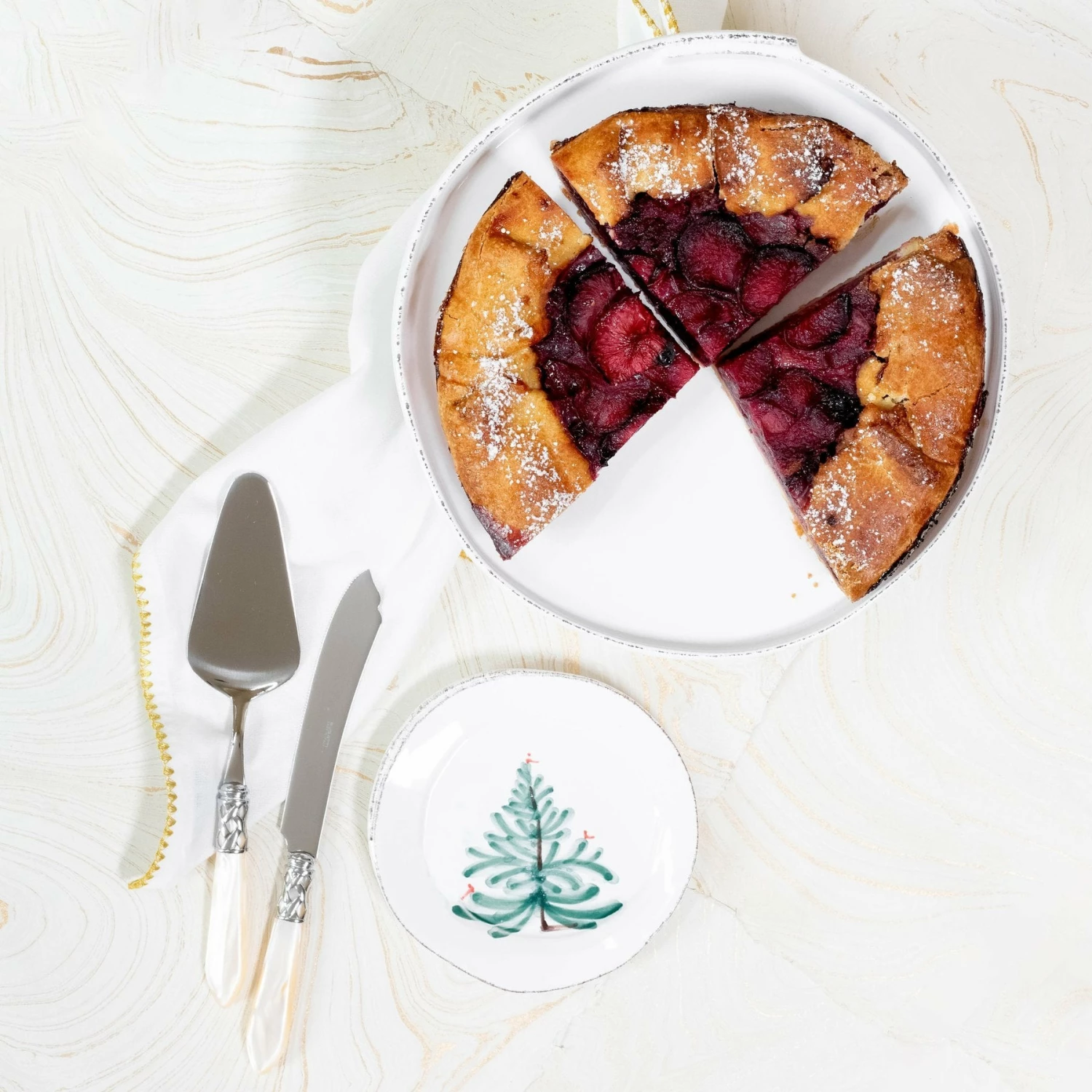 Charm your guests with the Holiday 4-Piece Cake Set featuring the Lastra White Large Cake Stand, a set of four Lastra Holiday Canape Plates, and the Aladdin Antique Ivory Pastry Server and Cake Knife.
