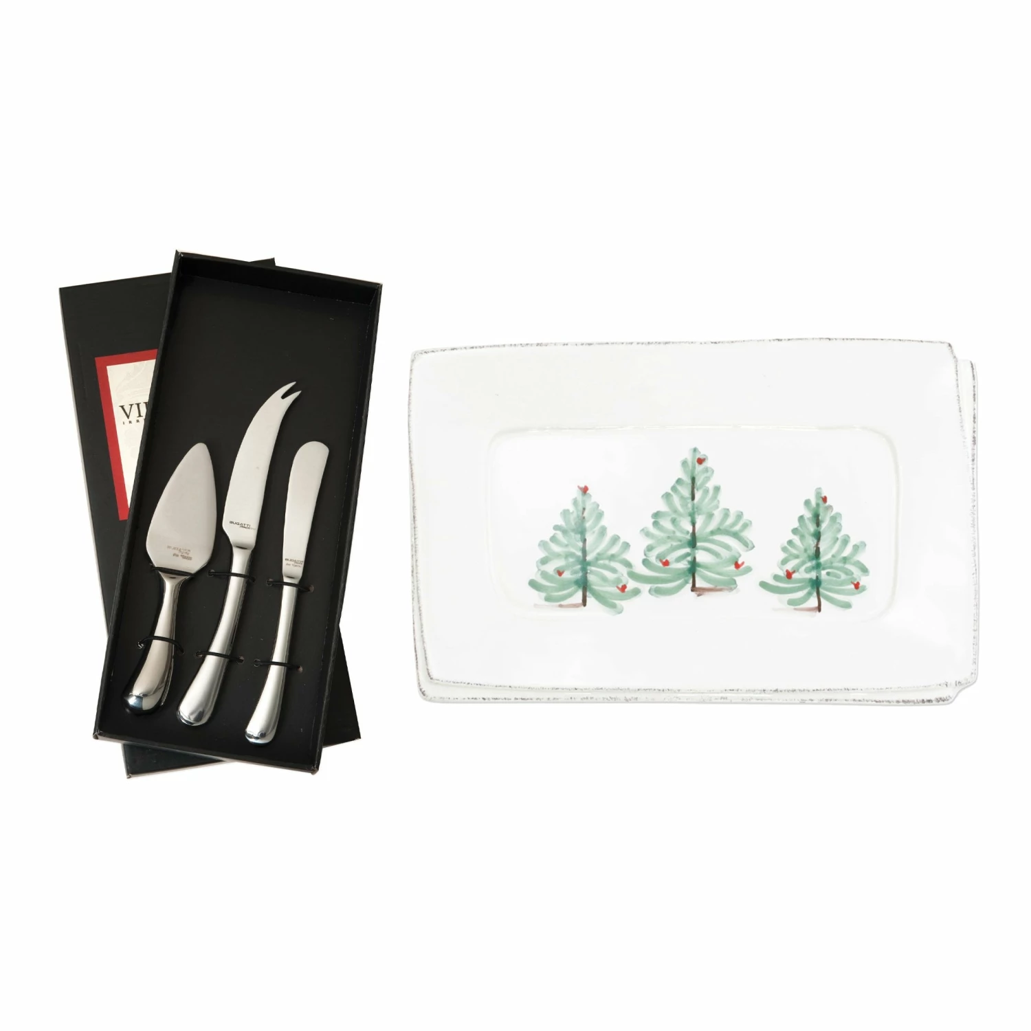 Cue the charcuterie and celebrate the gift-giving season with the Holiday Cheese Board Set featuring the classic Settimocielo Cheese Knife Set and the festive Lastra Holiday Small Rectangular Tray.