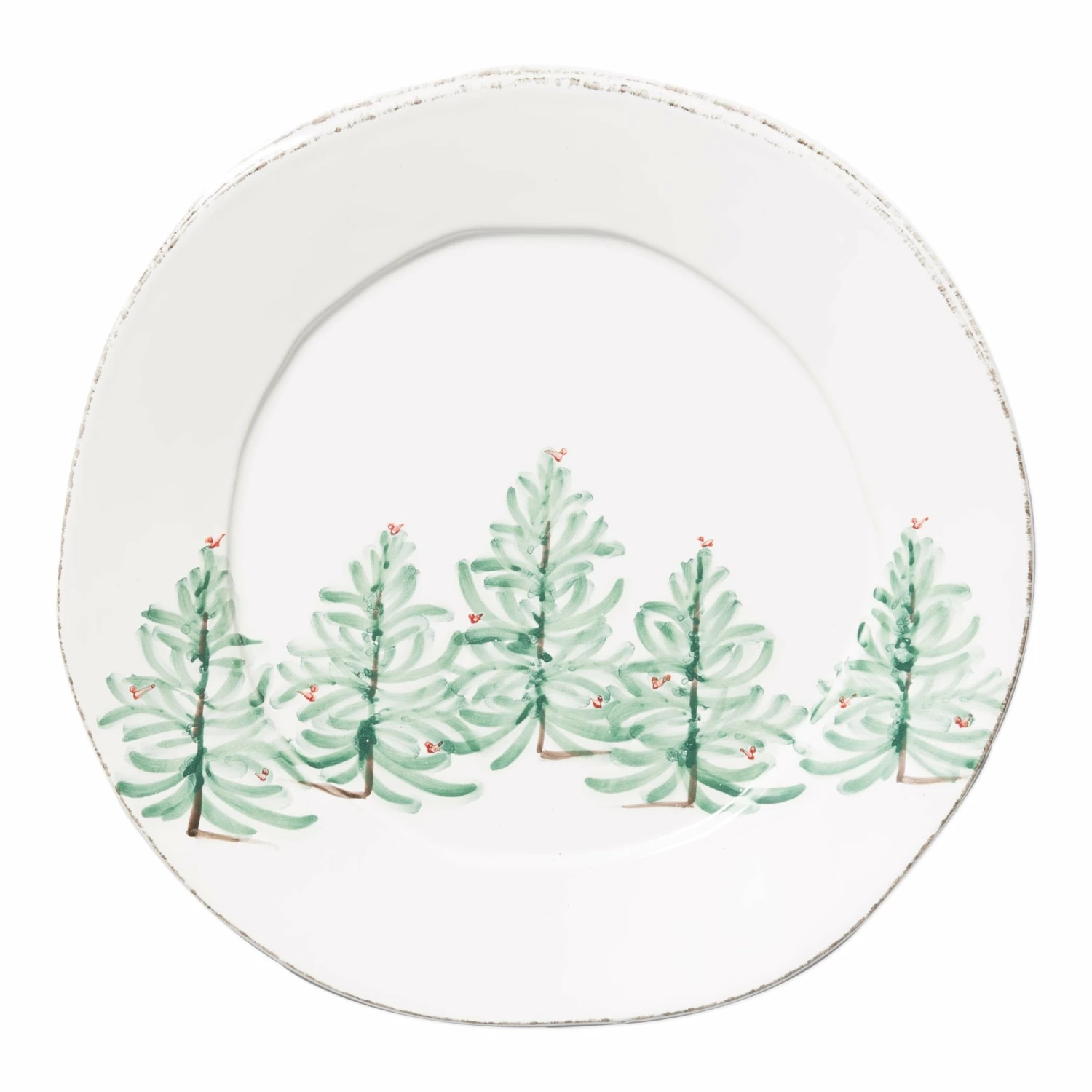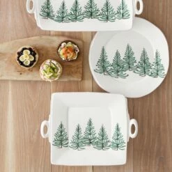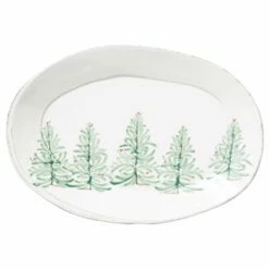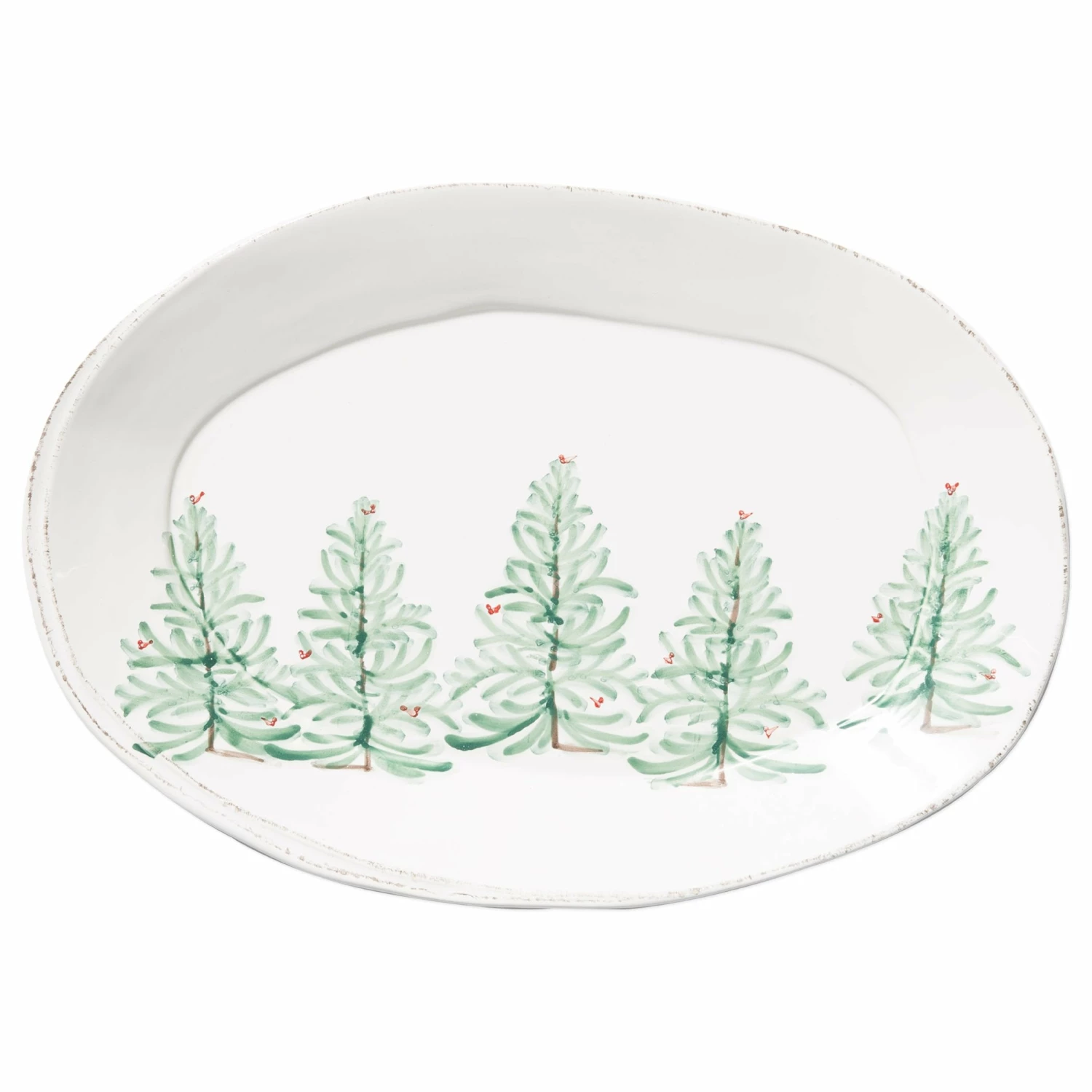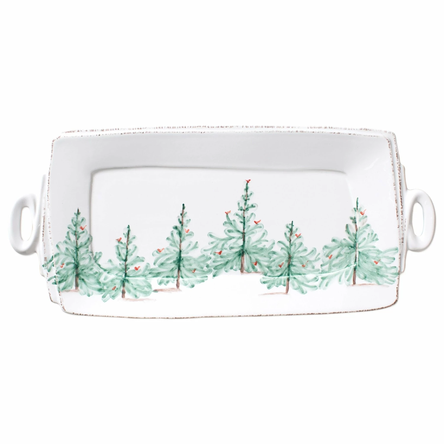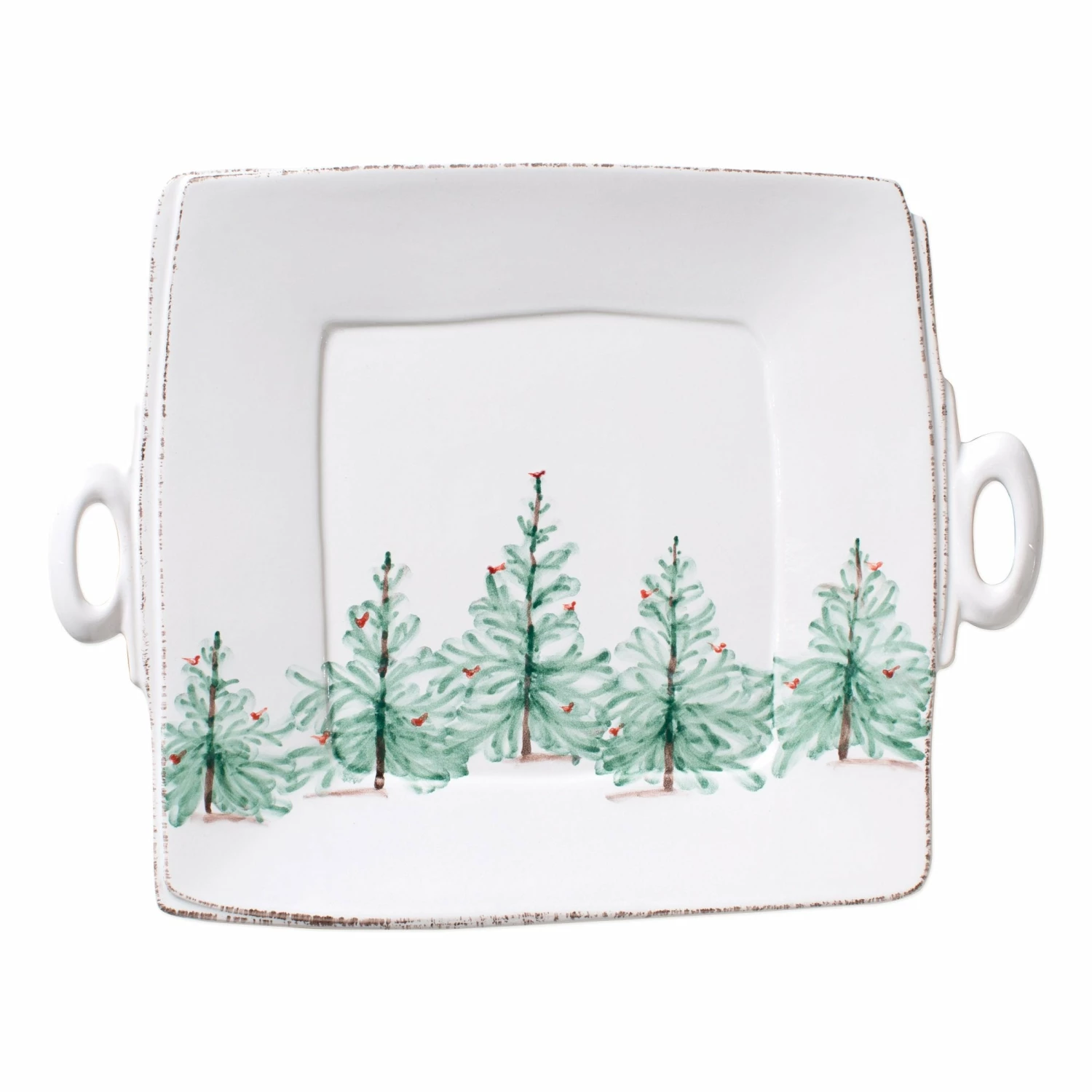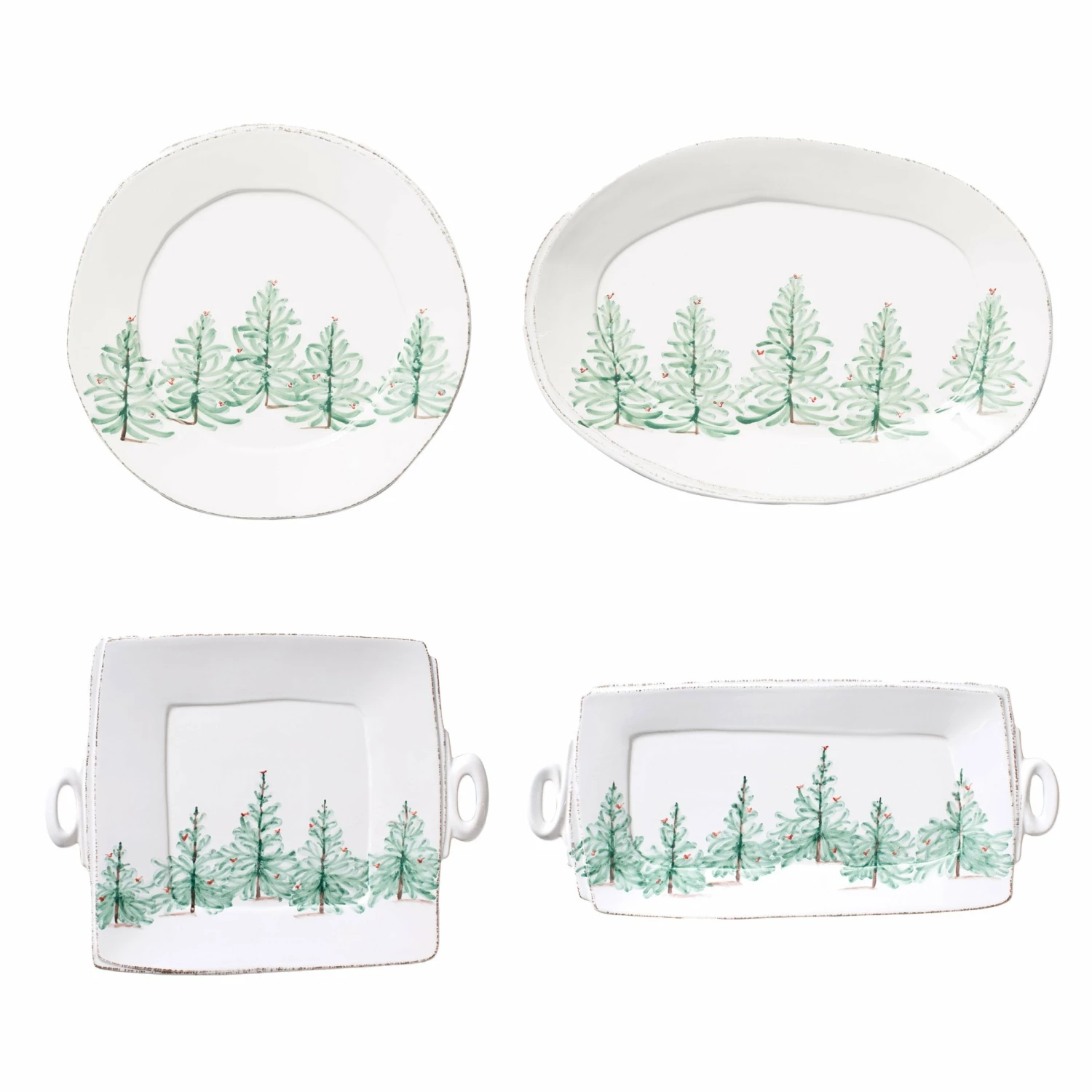 Make time for your loved ones when you gather around the cheerful design of the Lastra Holiday 4-Piece Serveware Set. Featuring handpainted fir trees, the Handled Square Platter, Oval Platter, Round Platter, and Handled Rectangular Platter make it easy to delight in the magic of the holiday season.