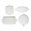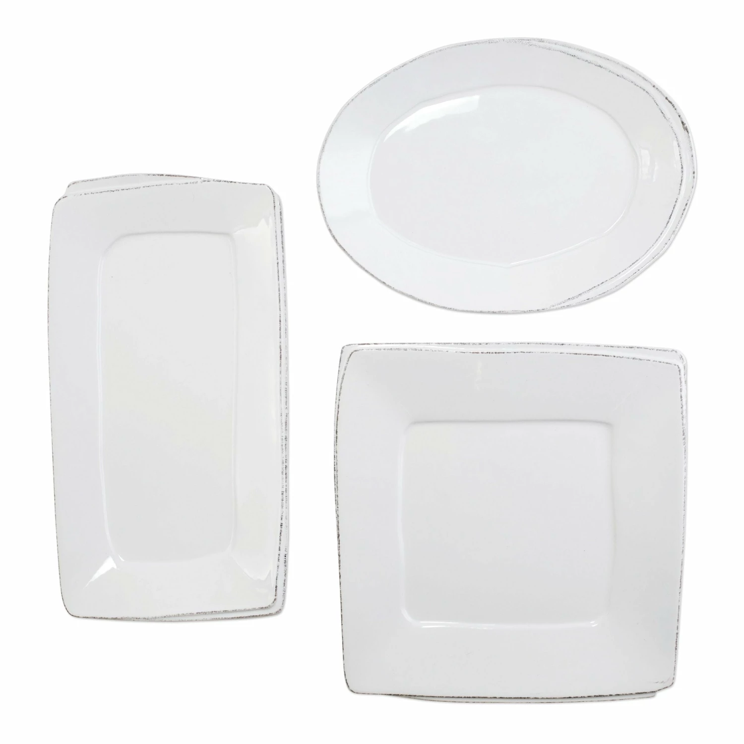 Beloved for its sophisticated simplicity, versatility, and durability, Lastra is our bestselling collection. The Lastra White Three-Piece Serveware Set includes the Lastra White Small Oval Platter, the Lastra White Square Platter, and the Lastra White Rectangular Platter. It is a beautiful set for anyone who likes to cook or entertain. Lastraβs design was inspired by the circular wooden slabs used for centuries to create the outer mold in cheesemaking throughout Italy. When fashioned together with twine, the hoop was left with a slight overlap to help maintain the shape of the cheese mold. Maestro molder Stefano Roselli incorporates the overlapping detail into the entire design, from its foot to its rim. A dark dusting on the edges of each piece suggests the ash that was used to preserve these cheeses and highlights each unique silhouette.