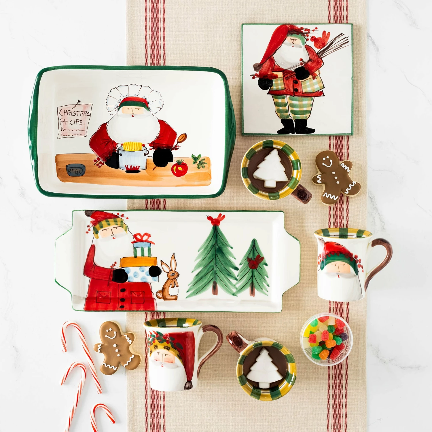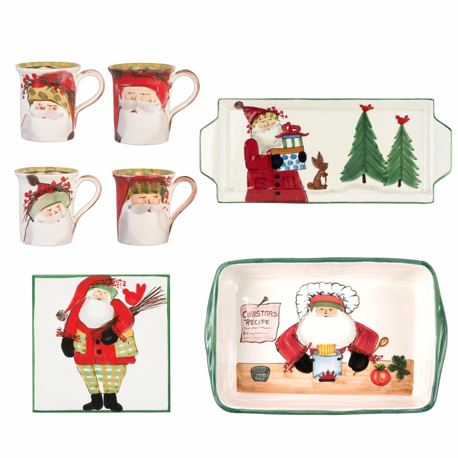 Delight in the magic of the holiday season with the Old St. Nick 4-Piece Hostess Set including Assorted Mugs, the Rectangular Baker, Trivet, and Handled Rectangular Platter. Maestro artisan, Alessandro Taddei, relays childhood memories of stories his mother used to read to him about Babbo Natale, Italyβs Santa Claus, through whimsical designs providing us a glimpse into daily adventures leading up to each holiday season.