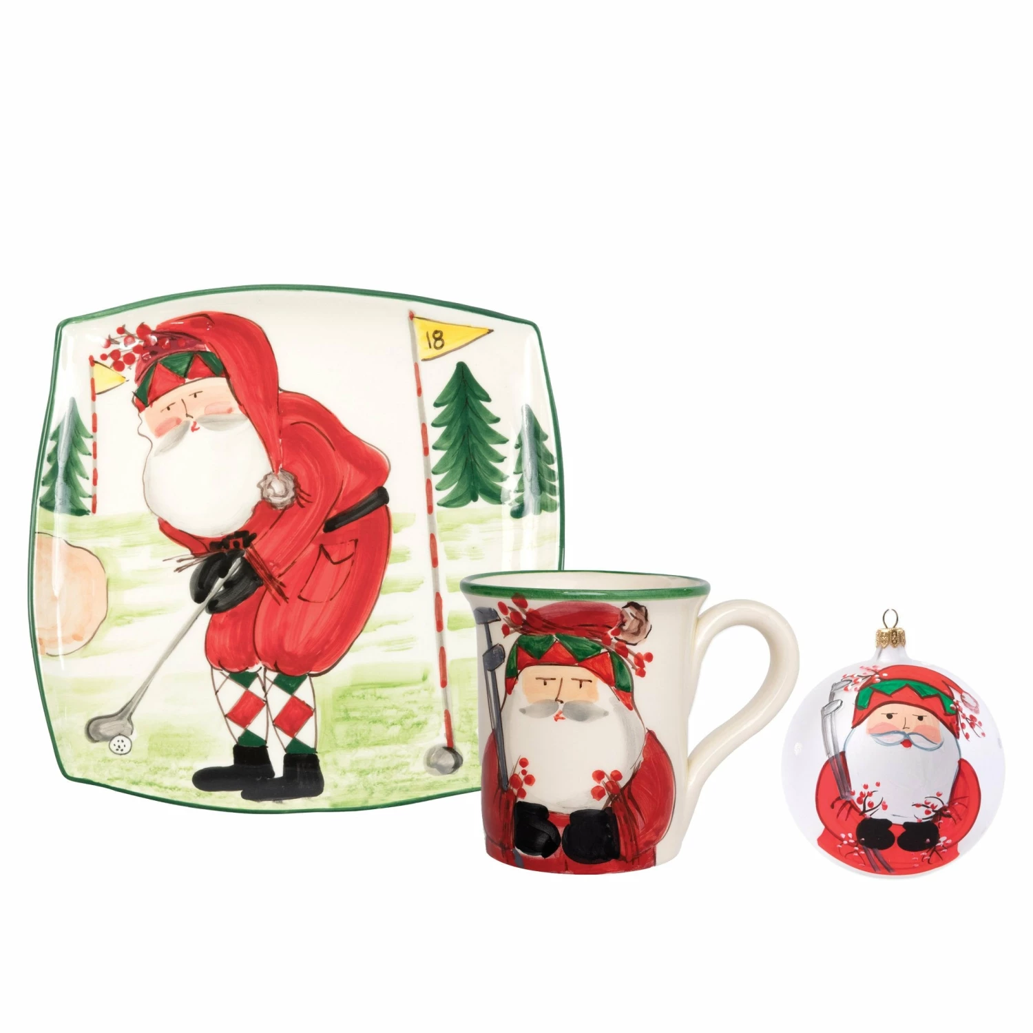 Delight in the magic of the holiday season with the Old St. Nick Golf Set including a Mug, Square Platter, and Ornament. Maestro artisan, Alessandro Taddei, relays childhood memories of stories his mother used to read to him about Babbo Natale, Italyβs Santa Claus, through whimsical designs providing us a glimpse into daily adventures leading up to each holiday season.