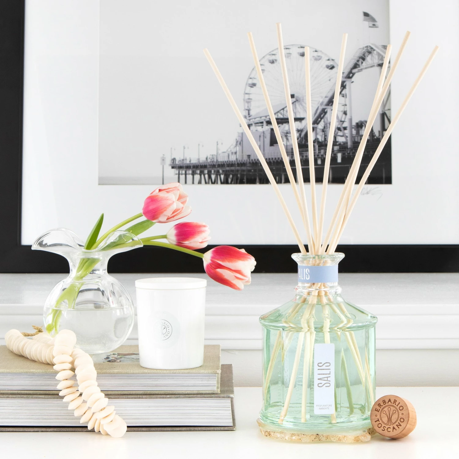 A celebration of the Mediterranean seaβs freshness and energy, the Salis Luxury Home Fragrance Diffuser has hints of thyme and chamomile that mingle and meld with the mineral saltiness of the ocean air. The diffuser comes in a beautiful mouthblown vessel that doubles as artwork in your home. To use, remove the stopper and dip the sticks into the fragrance. Flip the sticks upside down in order to renew the fragrance.
